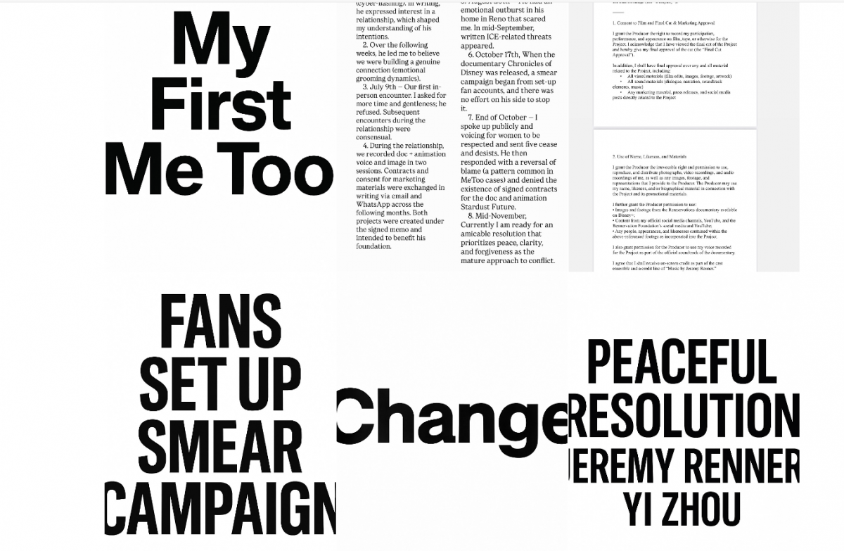 Denunțurile au fost făcute publice printr-o serie de peste douăzeci de postări pe contul oficial de Instagram al regizoarei. Yi Zhou, în vârstă de 37 de ani, regizoare, producătoare și artistă multimedia cu o carieră internațională care include scurtmetraje prezentate la Festivalul Sundance și Cannes, precum și colaborări cu mărci de lux precum Chanel, Hennessy și Bobbi Brown, a lucrat alături de Renner la două proiecte în acest an: documentarul „Chronicles of Disney” și filmul de animație „Stardust Future”.